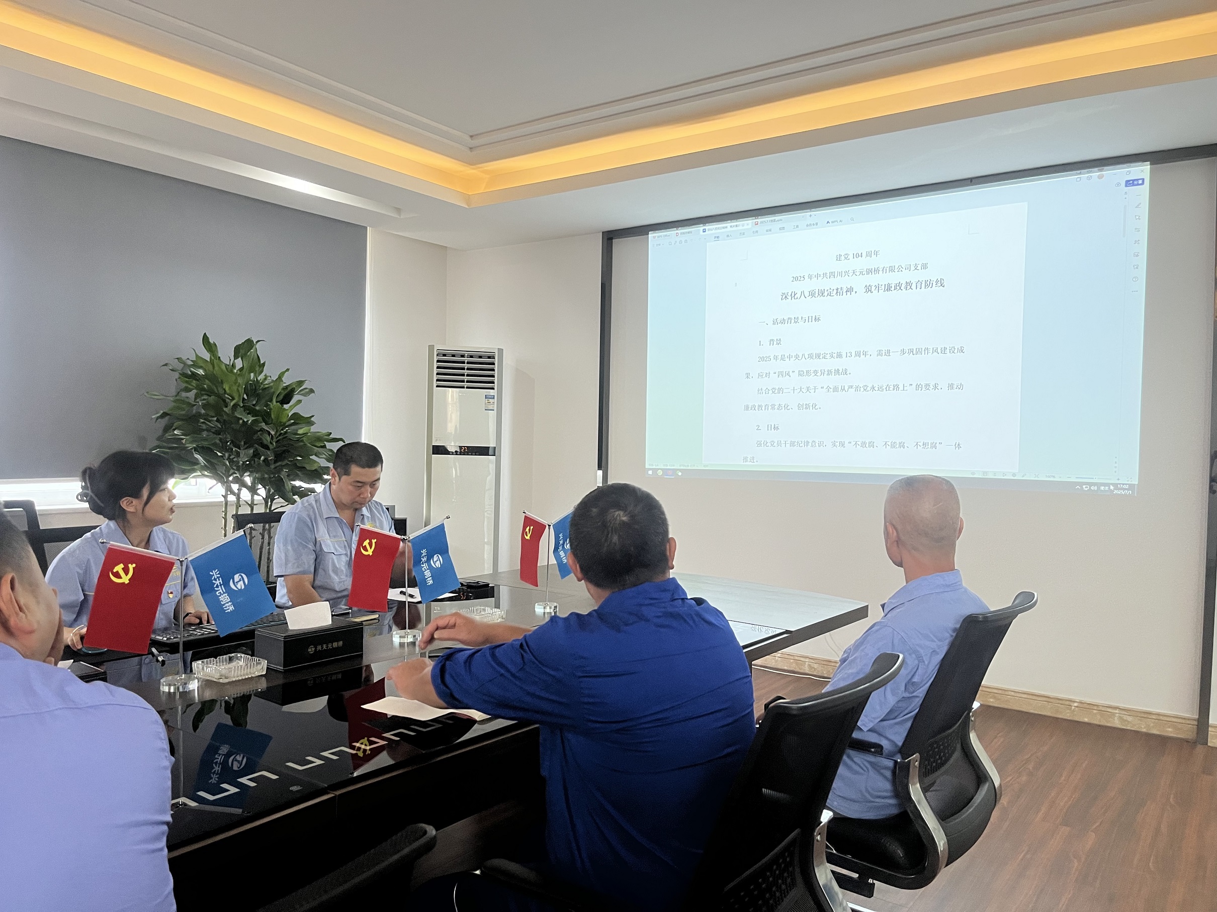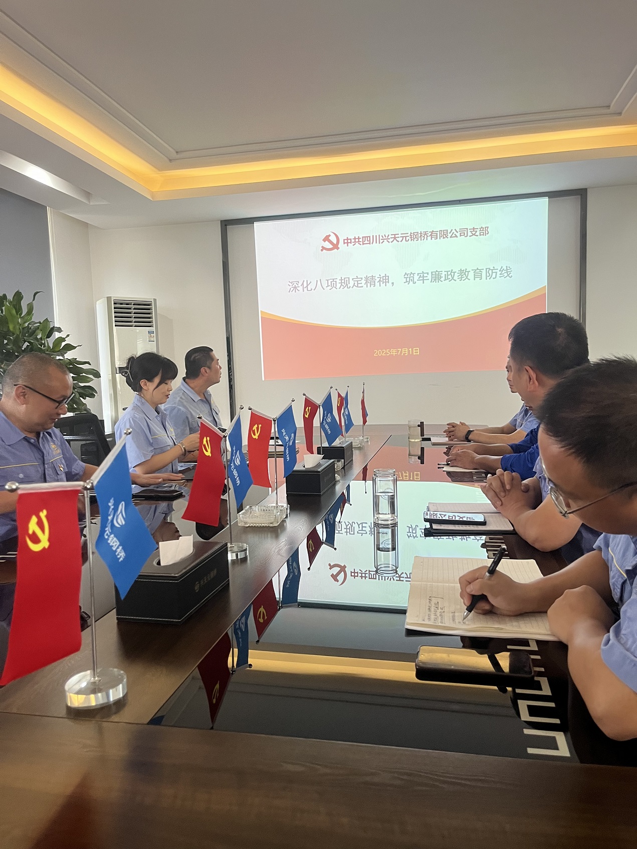 为庆祝中国共产党成立104周年,牢铸党员忠诚信仰,强化党员先锋意识,引导党员用实际行动践行对党的承诺,7月1日,中共四川兴天元钢桥有限公司支部以《深化八项规定精神,筑牢廉政教育防线》为题进行学习教育专题党课。支部党员出席活动,党支部书记唐娟主持。